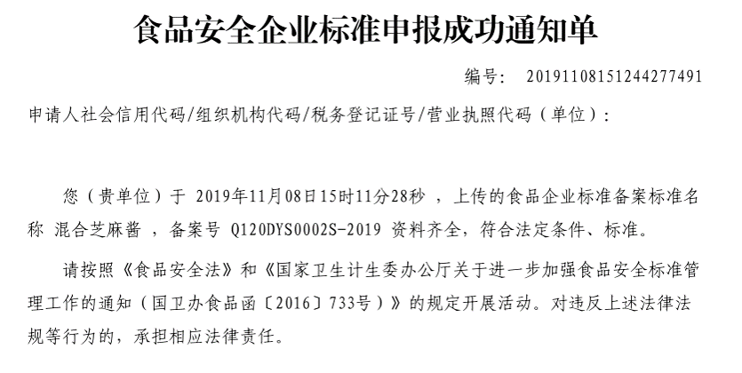天津東宇順油脂股份有限公司本次備案的企業(yè)標準《低溫冷榨芝麻油》、《混合芝麻醬》、《醇香芝麻醬》,經(jīng)過我公司技術(shù)人員朱麗真老師的編寫、備案,所提交的材料符合天津市衛(wèi)健委的備案要求,于2019年11月成功備案。