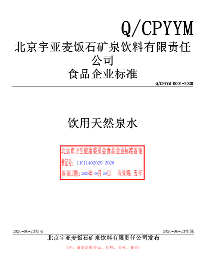北京宇亞麥飯石礦泉飲料有限責(zé)任公司本次備案的企業(yè)標(biāo)準(zhǔn)《飲用天然泉水》,經(jīng)過(guò)我公司技術(shù)人員黃占先老師的編寫(xiě)、備案,所提交的材料符合北京市衛(wèi)健委的備案要求,于2020年6月成功備案并在北京市食品安全標(biāo)準(zhǔn)管理系統(tǒng)公示。